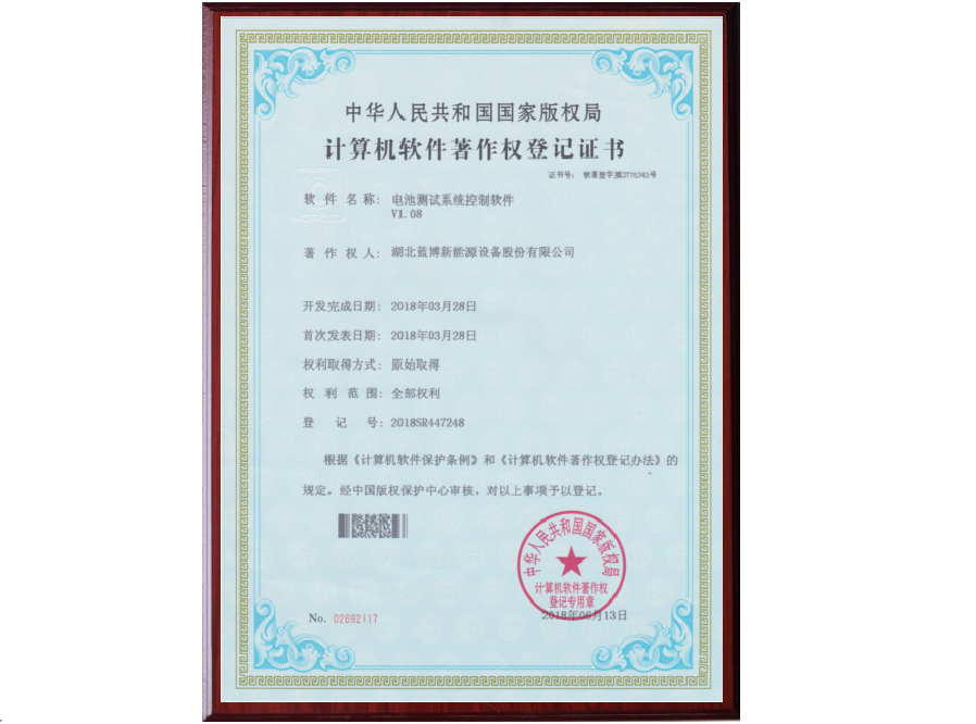 根據《計算機軟件保護條例》和《計算機軟件著作權登記辦法》的規定,經中國版權保護中心審核,中華人民共和國國家版權局對藍博公司提交的電池測試系統軟件著作權認定為原始取得并予以登記,從頒證之日起,這套電池測試系統軟件的版權將得到中國版權保護中心的有效保護。